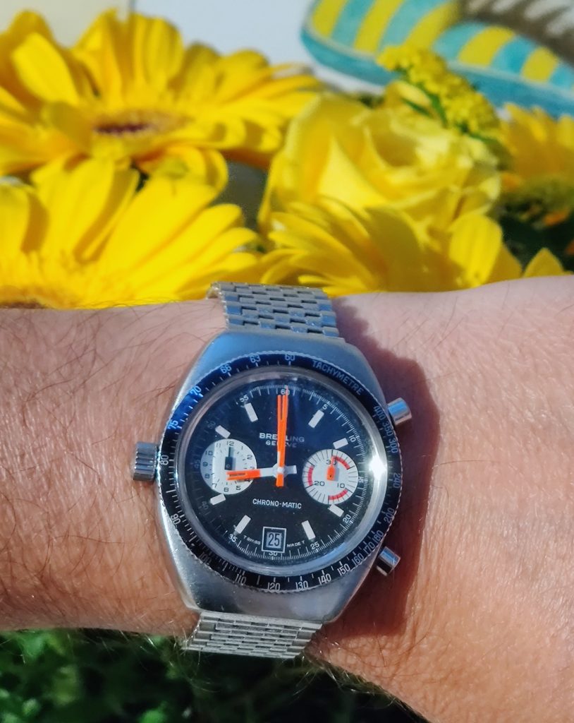 Initially, all 3 makers – Breitling, Hamilton and Heuer – branded their watches “Chrono-matic” but Breitling soon acquired that name. Here’s an example of a mid 1969 Breitling 2114, on a 19mm Geckota leather racing strap: